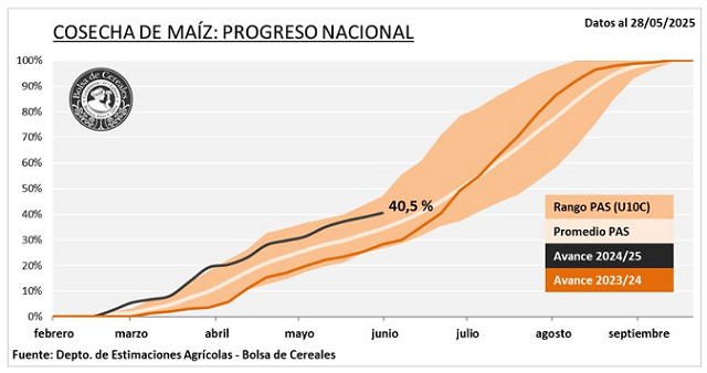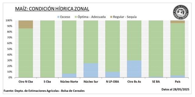 Por último, la cosecha de maíz con destino grano continúa avanzando lentamente a la espera de alcanzar la humedad óptima en grano. Al momento, se ha cosechado el 40,5 % del total nacional estimado, con un rinde medio de 80 qq/Ha. Hacia el norte del área agrícola, se reportan los primeros avances principalmente en el NOA con resultados que comienzan a reflejar el efecto del estrés hídrico sobre planteos de primera, los cuales se encuentran en torno a los 50 qq/Ha. Por otro lado, los sucesivos eventos de precipitaciones complican la situación en la provincia de Buenos Aires, lugar que reporta excesos hídricos entre un 10 y un 30 % según la zona. En este contexto, mantenemos nuestra proyección de producción en 49 MTn.
