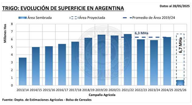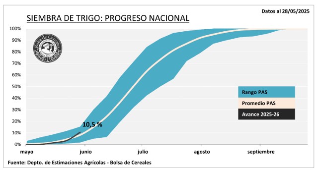 Inicio la campaña 2025/26 con las primeras 63.000 hectáreas implantadas, sobre un total proyectado de 1,3 MHa. Esto representa un avance del 4,8 %. El sudoeste de Buenos Aires ha iniciado las labores con gran celeridad.
