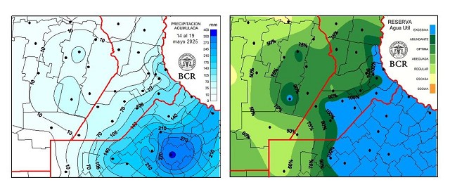 La tormenta de entre el 14 y al 19 de mayo dejó un saldo de 100 a 370 mm en el sudeste de la región núcleo. Las lluvias volvieron a golpear el noreste de Buenos Aires, zona que ya había recibido importantes volúmenes de agua en oportunidades anteriores. Chacabuco totalizó 370 mm en 72 hs, cuadruplicando el valor medio histórico de todo mayo. Rojas acumuló 290 mm, el valor más alto de los últimos 28 años para el mes. Baradero recibió 258 mm, marcando un record de lluvias en mayo de los últimos 19 años. A la fecha, el noreste de la provincia de Buenos Aires ya recibió entre el 70 y el 95% del total de agua de lluvia que acumula en el año.