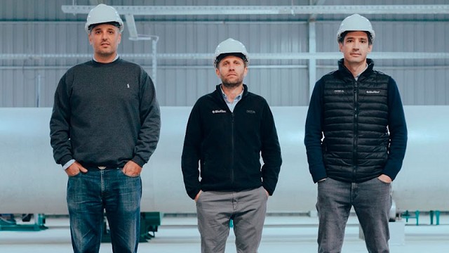 Rafael Jurado, Daniel Bianchi y Matías Lopresto, socios de Biofilm, en la nueva planta de Lobos
