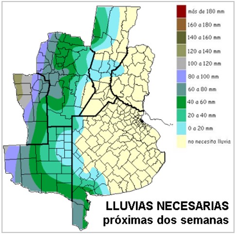 Por otra parte, las reservas de humedad se presentan excesivas en gran parte de la franja este del país, incluyendo el centro norte de la Mesopotamia, que recupero todo su atraso con las últimas lluvias. Con cero demanda de las coberturas y sin exigencia atmosférica, solo las zonas donde las lluvias se presentaron con valores más modestos, no reportan una condición de saturación. Esto se observa principalmente hacia áreas mediterráneas del norte y el centro del país. La estimación de necesidad de precipitaciones para las próximas dos semanas es bastante clara como indicador de estado.