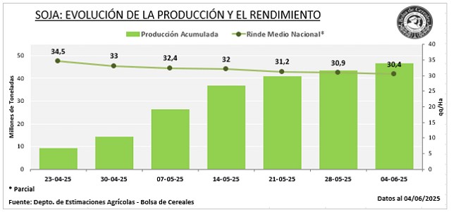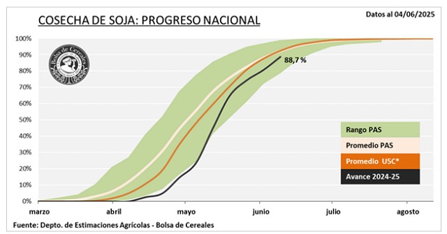 Tras un avance intersemanal de 7,9 p.p., la cosecha de soja a nivel nacional alcanza el 88,7 % del área apta. Aunque no se registraron precipitaciones en los últimos días, las labores aún presentan una demora de -3,5 p.p. en comparación con la campaña anterior y de -3,7 p.p. respecto al promedio de los últimos cinco años. Asimismo, el rendimiento promedio nacional se ubica en 30,4 qq/Ha. La soja de primera cubre el 92 % del área apta, con un rinde medio de 31,9 qq/Ha, habiéndose dado por concluida en la provincia de Córdoba. Por su parte, la soja de segunda registra un avance del 77,7 %, con un rendimiento promedio de 25,4 qq/Ha. A pesar de las demoras en la cosecha, se siguen observando rindes superiores a los esperados inicialmente, especialmente en el Núcleo Sur y oeste de Buenos Aires. Bajo este contexto, se mantiene la proyección de producción en 50 MTn.