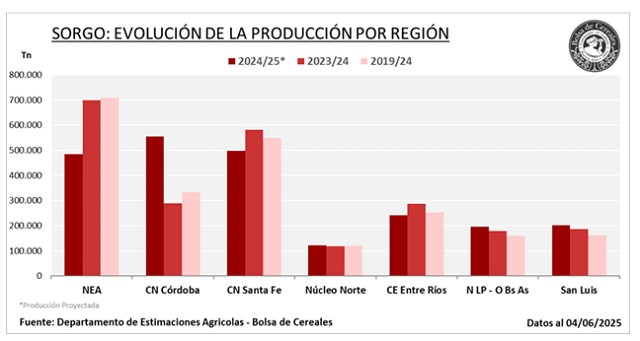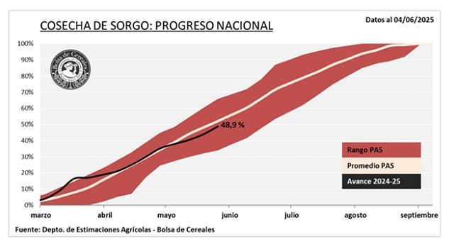 La cosecha de sorgo alcanza el 48,9 % del área con un rinde promedio de 37,9 qq/Ha. El C-N de Córdoba se perfila como principal región productora desplazando al NEA. Se mantiene la proyección de producción en 3 MTn.