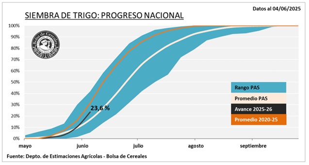 Luego de un progreso intersemanal de 13,1 p.p., la siembra cubre el 23,6 % de las 6,7 MHa proyectadas. Se mantiene una demora de 8 p.p. frente al promedio de las últimas cinco campañas.