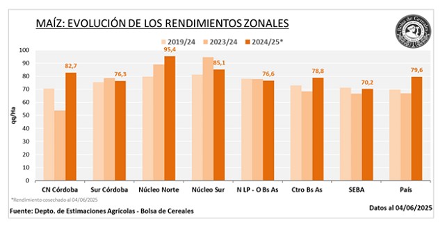 Se registró un progreso intersemanal de 3,3 p.p., con rendimientos que hasta el momento se encuentran en 80,2 qq/Ha para el maíz temprano y en 75,2 qq/Ha para el maíz tardío. Mantenemos nuestra proyección de producción en 49 MTn.