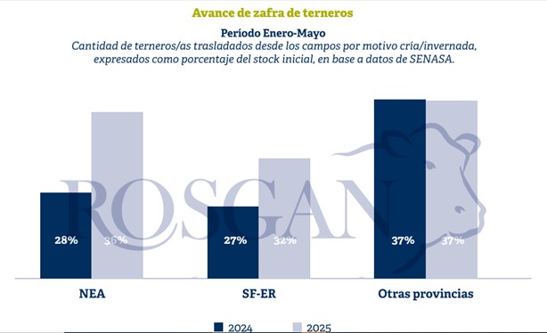 Del mismo modo, las provincias de Entre Ríos y Santa Fe, movieron en conjunto casi 890 mil terneros en lo que va del año, unos 160 mil más que en 2024, marcando en promedio un avance de zafra del 32%, frente al 27% registrado a igual fecha del año pasado.