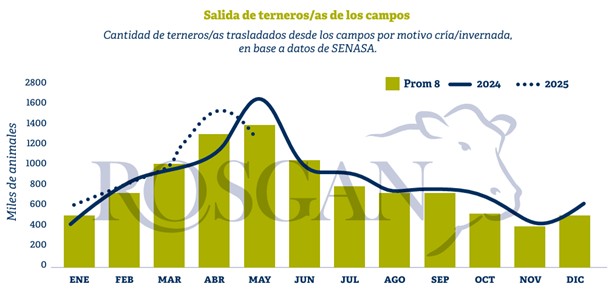 Sin embargo, en el acumulado de los primeros cinco meses del año, la salida total de terneros sigue siendo elevada. En términos absolutos, los datos de traslados informados de enero a mayo de este año reportan un total de 5,29 millones de animales que, medido sobre el stock de terneros disponibles al 31 de diciembre del año pasado, representan un 36,2%, el segundo dato más alto de los últimos 10 años, detrás de 2023 y 2022, y 2 puntos por arriba a lo registrado un año atrás.