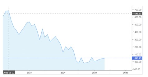 Abajo vemos la evolución del precio de la soja (bushels) desde mayo de 2022 a la fecha.
