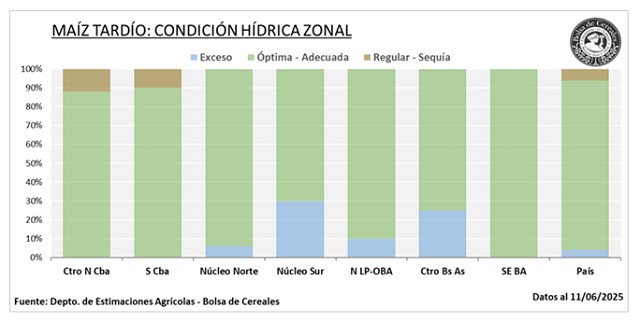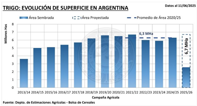 Sin embargo, las características topográficas y edáficas del centro y norte bonaerense, junto con condiciones de elevada humedad ambiente y bajas temperaturas que dificultan el secado del suelo, obstaculizan el avance de las sembradoras. Esta situación interrumpe las siembras de ciclos largos e impide cumplir con el planteo inicial de siembra en esos sectores, reflejando demoras en el progreso de las labores. No obstante, en los núcleos trigueros del sur del área agrícola, la siembra progresa a buen ritmo aprovechando las buenas condiciones climáticas. Bajo este escenario, el área proyectada a escala nacional se mantiene en 6,7 MHa, con algunos reajustes zonales. Actualmente, el avance de siembra alcanza el 38,5 % del total, con un progreso intersemanal de 14,9 puntos porcentuales.
