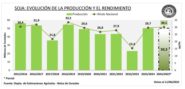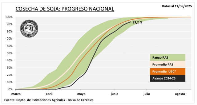 La cosecha cubre el 92,3 %, con un rinde promedio de 30,1 qq/Ha a nivel nacional. Se ha recolectado el 85,5 % de la soja de segunda, con rindes superiores a los esperados. Bajo este contexto, elevamos la proyección de producción a 50,3 MTn.