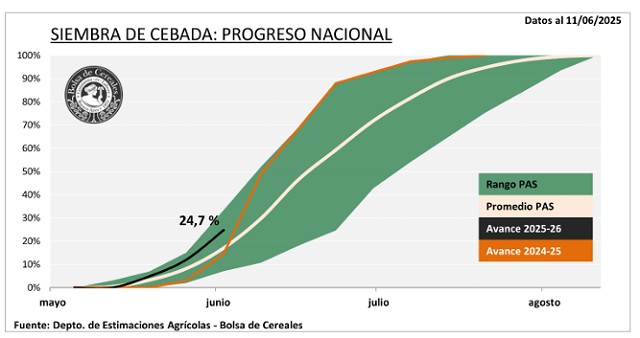 A su vez, con un progreso interquincenal de 19,9 p.p., la siembra de cebada ya cubre el 24,7 % de los 1,3 MHa proyectadas para la campaña 2025/26. Las labores registran un adelanto interanual de 9,7 p.p. y se ubican 4,7 p.p. por encima del promedio de las últimas cinco campañas. Este ritmo sostenido se explica, principalmente, por los avances en los núcleos cebaderos del sur, donde se concentra la mayor superficie proyectada y la buena disponibilidad de humedad permite avanzar con fluidez. En el norte de La Pampa y sudoeste de Buenos Aires, la siembra progresa a buen ritmo, con alrededor del 20 % del área implantada ya mostrando una buena emergencia. En el sudeste bonaerense, donde las labores también avanzan con dinamismo, especialmente en la zona de Tres Arroyos, casi el 30 % del área sembrada ha emergido en condiciones óptimas de humedad.