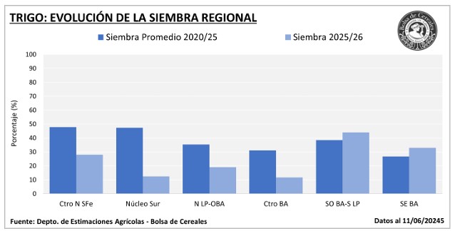Luego de un progreso intersemanal de 14,9 p.p., la siembra cubre el 38,5 % del área proyectada en 6,7 MHa. Debido a los excesos en el centro y norte bonaerense, las labores reflejan una demora interanual de -7,8 p.p.