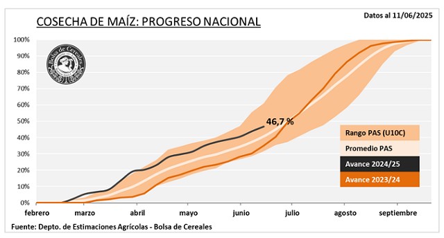Luego de un progreso intersemanal de 2,9 p.p. el avance de la cosecha se ubica en 46,7 % de total nacional con un rinde medio de 78,6 qq/Ha. Mantenemos nuestra proyección de producción en 49 MTn.