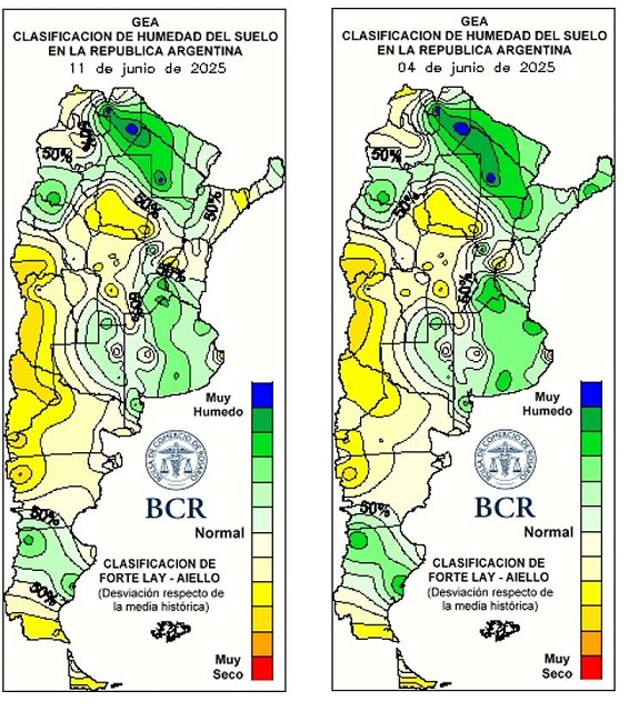 En la última semana, la siembra de trigo avanzó 35 puntos porcentuales en la región núcleo y alcanza el 55% del área proyectada, igualando el progreso del año pasado para esta misma fecha. En el centro-sur de Santa Fe, las labores están prácticamente finalizadas y los primeros lotes, implantados desde el 22 de mayo, muestran emergencias muy buenas. En el sur santafesino se sembró el 45% del trigo. Los retrasos responden a excesos de humedad por las jornadas nubladas, nieblas persistentes y lloviznas intermitentes que mantuvieron los suelos saturados, sumados a las demoras en los barbechos. En el noreste bonaerense, las tareas comenzaron a generalizarse tras el avance lento por el barro y la elevada humedad en los lotes. Allí, se sembró el 20% del trigo. En cambio, en el noroeste de Buenos Aires la implantación ya alcanza el 45%. En el sudeste de Córdoba —particularmente en Monte Buey y Corral de Bustos— se reportan avances del 80% al 90% en la siembra.