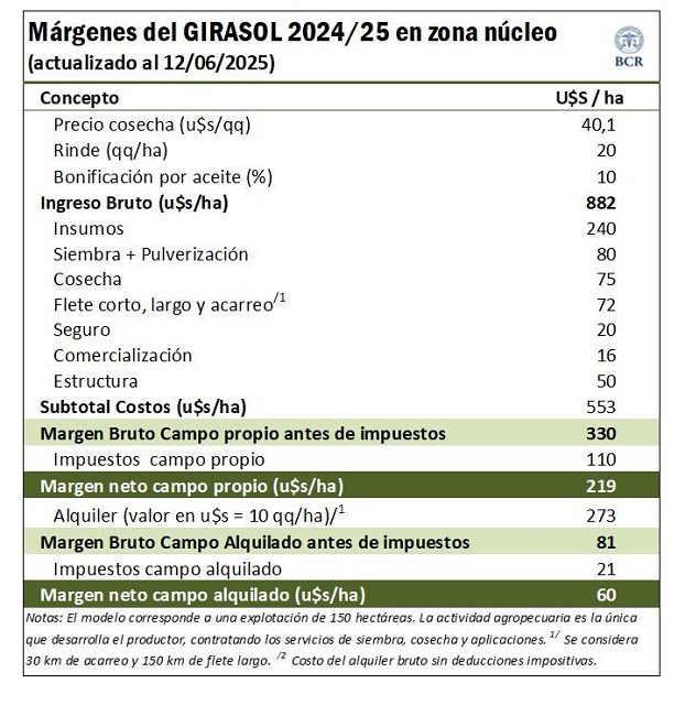 La renta del girasol en campo propio es de 219 u$s/ha, con rindes promedio de 20 quintales. En campo alquilado, ese margen baja a 60 dólares, pero sigue siendo positivo y atractivo para productores que buscan cuidar la inversión y reducir riesgos. En comparación, una soja sembrada en ambientes restrictivos , donde los rindes no superan los 30 quintales por hectárea, deja un margen neto de 154 u$s/ha en campo propio, pero se vuelve negativa en campo alquilado, arrojando una pérdida de 15 dólares por hectárea, una vez descontados los impuestos y considerando un alquiler de 10 quintales por hectárea.