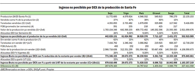 Se estimó cuanto impactaría el retorno de las alícuotas anteriores al 27/1/2025 de DEX en los ingresos de los productores de la provincia de Santa Fe a partir del 1/7/2025 por lo que resta de la campaña 2024/2025: