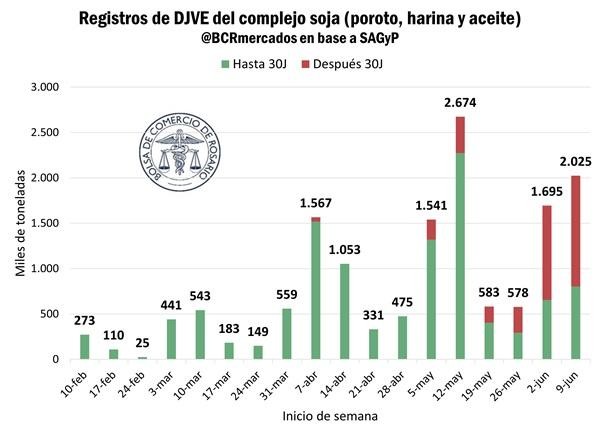 Por otro lado, al igual que se mencionó para el caso del maíz en el Reporte de Mercado de la semana pasada, comienza a observarse un crecimiento en el registro de DJVE del complejo soja con un crecimiento de la participación de los embarques posteriores al 30J.