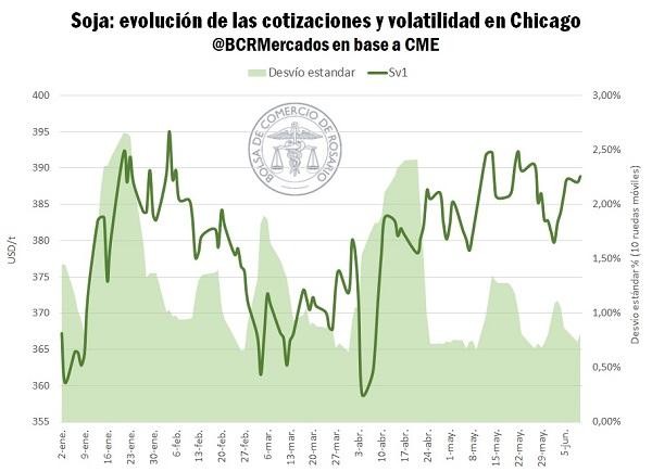 Esta constante incertidumbre generó una fuerte reacción inicial en el mercado. Entre enero y fines de abril, los futuros de soja mostraron alta inestabilidad, operando en un rango de +/- 10% y alcanzando una dispersión media del 2,3%. Los precios tocaron los USD 395/t en febrero para luego caer a USD 359/t en abril y volver a subir a USD 395/t semanas después.