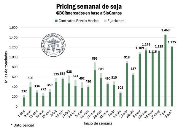 Según los datos de SioGranos, la semana pasada se alcanzó el mayor volumen de pricing semanal en el año, con cerca de 1,47 Mt acumuladas en compras a precio hecho y fijaciones por soja. Esto implica un crecimiento del 30% respecto del promedio semanal de mayo. En el mes pasado, el volumen de pricing semanal se mantuvo estable entre 1,11 y 1,18 Mt.