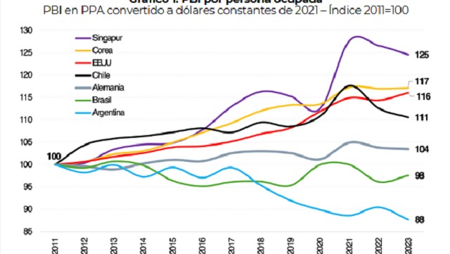 Mientras tanto, otros países siguieron trayectorias con avances en productividad laboral. En Asia, Singapur y Corea del Sur lograron aumentos del 25% y 17%, respectivamente, impulsados por estrategias orientadas a la apertura comercial, la inversión en tecnología y la formación de capital humano. Incluso en América Latina, donde los desafíos son similares a los de Argentina, los resultados fueron más favorables. Chile, por ejemplo, registró una mejora del 11% en el período, mientras que Brasil, aunque con altibajos, finalizó 2023 con un nivel de productividad por encima del argentino.