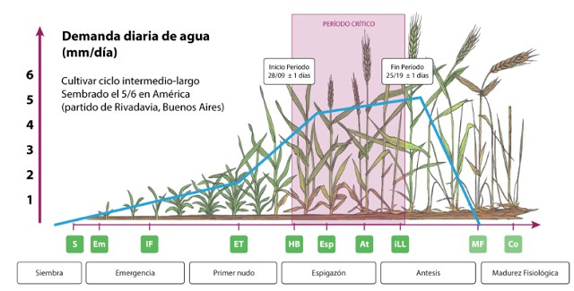 Pensar el cultivo como un sistema con balance hídrico ayuda a dimensionar su importancia: para evitar pérdidas de rendimiento, la demanda de agua debe ser cubierta por una oferta suficiente. El trigo absorbe agua del suelo, que transpira para sostener su crecimiento. Esa demanda hídrica varía con el avance de su ciclo y el cambio estacional.