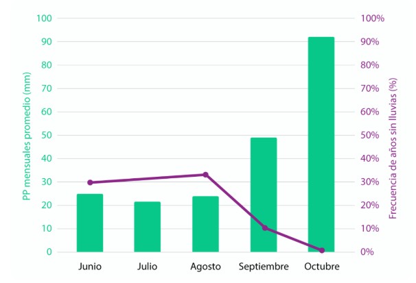 En el oeste pampeano, las lluvias invernales suelen ser escasas. Por ejemplo, en América (Buenos Aires), el promedio histórico entre junio y agosto apenas alcanza los 60 mm, con muchos años sin lluvias durante uno o más meses (Figura 2). Esta cantidad no cubre los 100 mm de demanda estimada para esa etapa. En septiembre llueven en promedio 50 mm, pero también es insuficiente frente a una demanda cercana a 90 mm. Esto hace indispensable que el cultivo cuente con reservas hídricas previas a la siembra.