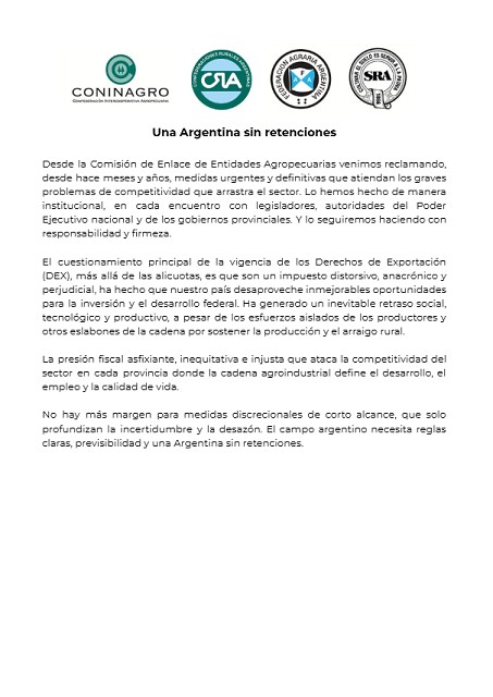 Bajo el título “Una Argentina sin retenciones”, la Comisión de Enlace de Entidades Agropecuarias —integrada por la Sociedad Rural Argentina (SRA), Confederaciones Rurales Argentinas (CRA), Coninagro y Federación Agraria Argentina (FAA)— difundió un fuerte comunicado en el que reclaman medidas urgentes y definitivas para resolver los históricos problemas de competitividad del sector agroindustrial.