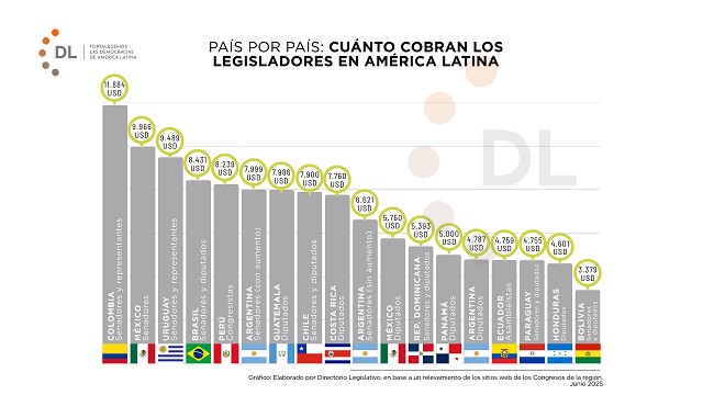 En República Dominicana, los legisladores cobran 5.393 dólares, mientras que en Panamá los asambleístas reciben 5.000 USD. Le siguen Ecuador, con ingresos mensuales por 4.759 USD; Paraguay, con sueldos de 4.755 USD; y Honduras, con 4.601 USD. En la base de la escala, Bolivia presenta los salarios más bajos de la región: allí tanto diputados como senadores perciben salarios de 3.379 dólares.