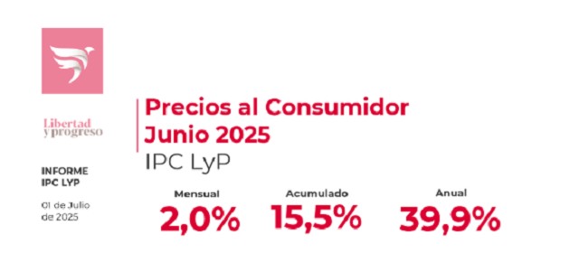 Según el relevamiento del IPC de la Fundación Libertad y Progreso, la inflación de junio fue del 2,0% mensual, lo que representa una aceleración de medio punto porcentual respecto al dato oficial de mayo (1,5%). A pesar del leve repunte, la inflación acumulada del primer semestre se ubica en 15,5%, y la variación interanual cae al 39,9%, el registro más bajo desde febrero de 2021.