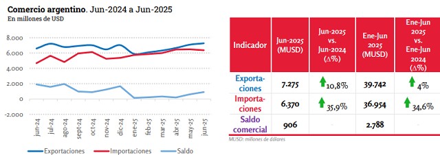 Argentina alcanzó en junio de 2025 su mayor superávit comercial del año, con un saldo positivo de USD 906 millones, según el Monitor Comex publicado por el Instituto de Estrategia Internacional. Este dato representa el 19° mes consecutivo con superávit, tras los déficits registrados entre marzo y noviembre de 2023.