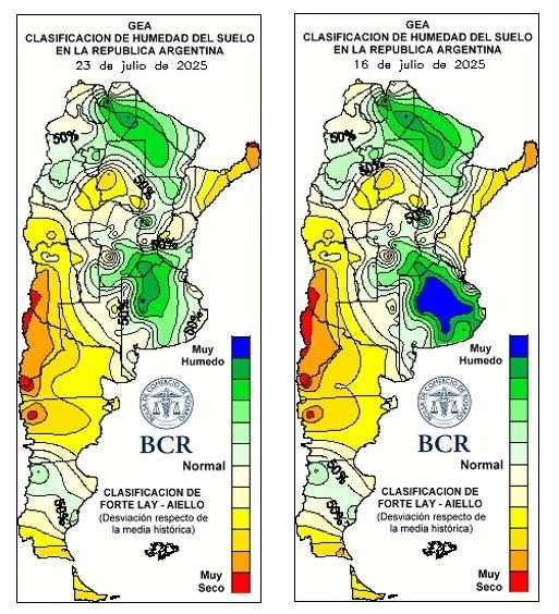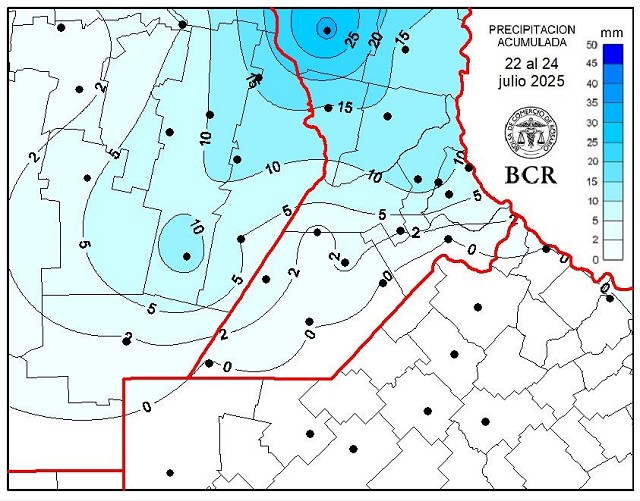 Las lluvias del 22 al 24 de julio privilegiaron la zona que había quedado con menor cobertura la semana pasada, el norte de Rosario, y sumaron milímetros en el oeste de la región núcleo.
