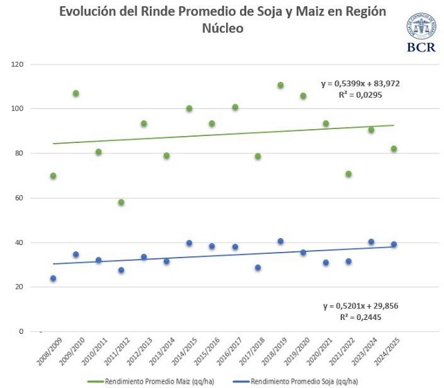 Al comparar soja y maíz, es tan leve la tendencia positiva en ambos cultivos que indica que no hay una mejora significativa a lo largo del tiempo. Esto sale de analizar el gráfico sobre la evolución del rendimiento promedio de soja y maíz en región núcleo a lo largo de las últimas 16 campañas, exceptuando la 2022/23 por su sequía extrema. Es interesante señalar que el valor R2, el coeficiente de determinación, muestra valores muy bajos que indican que no hay un patrón claro de mejora sostenida en los rindes. En el caso del maíz, los rindes oscilaron entre 60 y 110 qq/ha, incluyendo la campaña de la sequía, mientras que la soja estuvo entre 25 y 42 qq/ha, con el mínimo también en la campaña 2022/23.