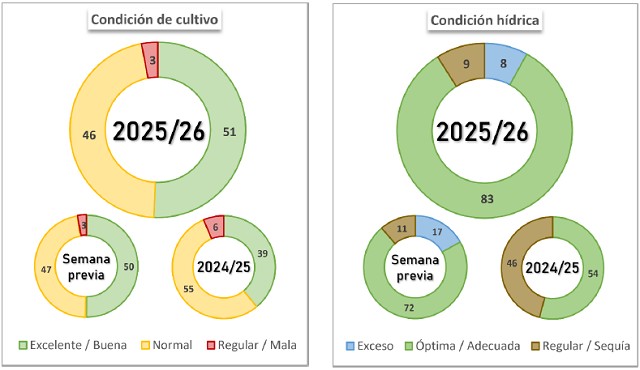 Estas modificaciones responden, por un lado, a una intencionalidad positiva sostenida a lo largo de las últimassemanas en los núcleos productivos y la provincia de Santa Fe y, por otro lado, a la imposibilidad de cumplir con losplanteos originales de siembra en sectores bajo condiciones de anegamiento del centro-este y sur agrícolas que, segúninforman los colaboradores, no lograrían recuperarse antes del cierre de la ventana de siembra, y en consecuencia yase destinarían a la siembra de gruesa. Respecto al área emergida, el 97,5 % del área sostiene una condición entreNormal y Excelente y el 82,3 % presenta humedad entre Adecuada y Óptima, encontrándose el 80,8 % transitandodesde expansión foliar en adelante.