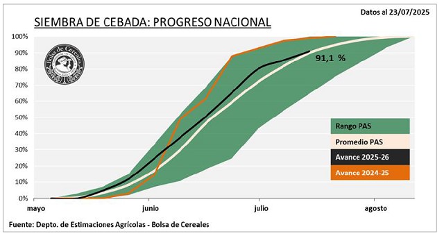 Luego de un progreso interquincenal de 11,1 p.p. la siembrade cebada entra en su recta final, cubriendo el 91,1 % de lasuperficie proyectada. Se registran algunas demoras sobreel centro y sur de Buenos Aires.
