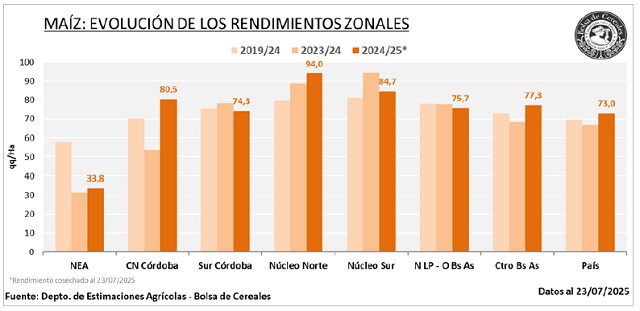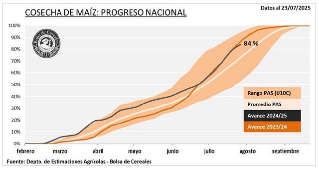 Por último, la cosecha de maíz con destino grano avanzó 5,1 p.p. durante la última semana, alcanzando el 84 % deltotal nacional. Este progreso representa un adelanto de 6,7 p.p. respecto al promedio de los últimos cinco ciclos,aunque aún se encuentra 2,6 p.p. por detrás del ritmo del año pasado. A medida que ingresan mayores volúmenes deproducción del norte del país, los rendimientos promedio muestran una tendencia descendente, afectados porresultados muy por debajo de los promedios históricos en esa región. El rinde medio nacional se ubica actualmente en73 qq/Ha, con una proyección para la campaña 2024/25 de 71,6 qq/Ha. Por otra parte, los excesos hídricos persistenen el centro de la provincia de Buenos Aires, limitando el ingreso de cosechadoras a los lotes y generando demorassignificativas en el ritmo de recolección. En algunas zonas, las diferencias interanuales en el progreso de cosechaoscilan entre -5 y -12 p.p. En este contexto, se mantiene la proyección de producción nacional en 49 MTn.