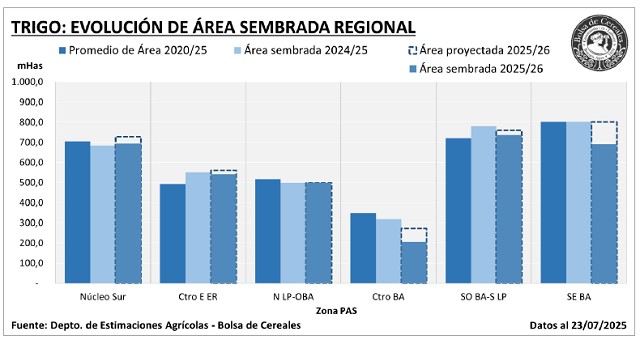 Luego de un avance interquincenal de 11,1 p.p., la siembra de cebada cubre el 91,1 % de la superficie apta a nivelnacional. Sin embargo, persiste una demora interanual de -8 p.p. debido a excesos hídricos, especialmente en el centroy sur bonaerense, en particular sobre los partidos de Saladillo y Tandil. El 90 % de los lotes sobre los núcleos cebaderosdel sur, presenta una condición hídrica Óptima/Adecuada. Asimismo, el cultivo avanza en sus primeras etapas, en elsudeste, el 74 % del área ha emergido, con un 45 % en diferenciación foliar y un 5 % iniciando macollaje, registrandoun 92 % de lo implantado bajo una condición de cultivo entre Normal/Buena. Sobre el sudoeste, se registra un lentodesarrollo del cultivo por las bajas temperaturas, con un 38 % en la etapa de diferenciación foliar reflejando óptimascondiciones de cultivo.