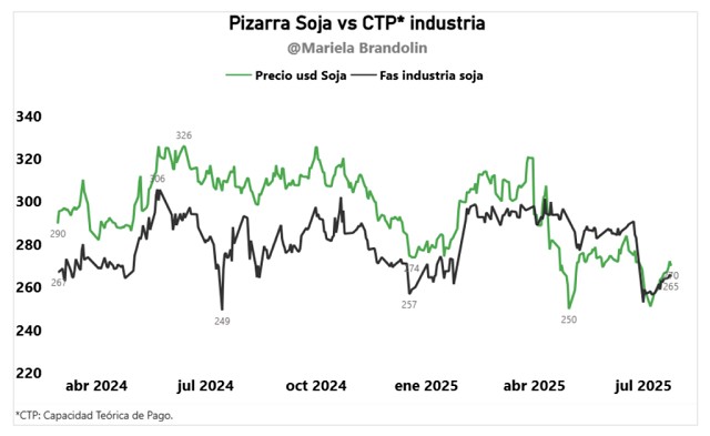 En los próximos días deberíamos ver un reacomodamiento del mercado. Es cierto que los rumores y la expectativa de la baja ya habían empujado los precios al alza (especialmente en soja), pero aún podríamos ver mejoras. Si tomamos la reducción en poroto de soja, del 33% al 26%, se traduce en una mejora teórica de28 USD en el FAS (capacidad de pago desglosada del precio FOB). Sin embargo, vale recordar que la soja ya se encontraba 15 USD por encima de ese FAS, lo que nos dejaría una mejora neta de 13 USD. Ahora bien, si analizamos lo que venía pagando la industria, estaba unos 8 USD por encima del FAS (o 5 USD si tomamos como referencia la pizarra, como muestra el gráfico). En ese caso, y considerando los 28 USD de mejora teórica, el precio podría subir unos 20 USD.