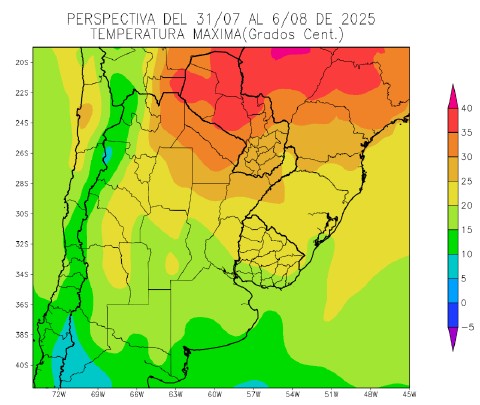 El nordeste del NOA, el sudeste del Paraguay, el sur de la Región del Chaco, el sur de Misiones, el norte de Corrientes y el norte de Santa Fe observarán temperaturas máximas superiores a 25°C, con registros superiores, de hasta más de 35 °C, hacia el norte.