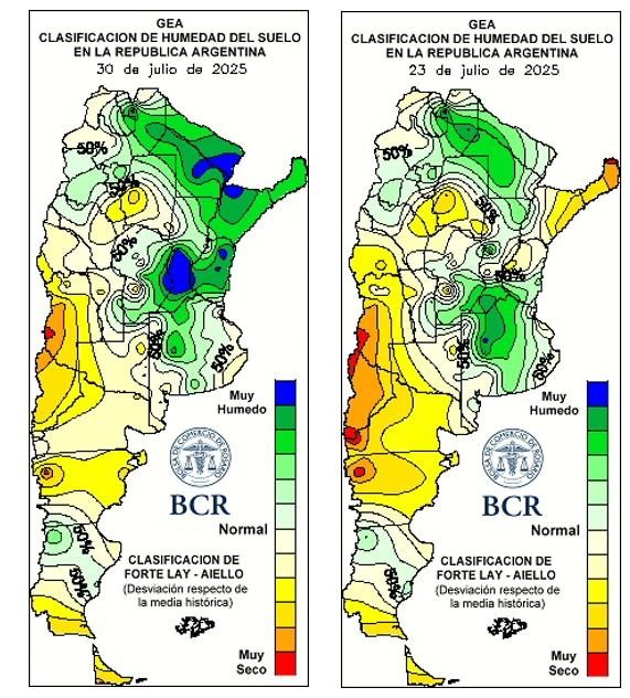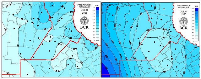 Volvió a llover el fin de semana pasado (del 26 al 28/7), con registros que sobrepasaron por lejos los pronósticos más optimistas: Carlos Pellegini acumuló 60 mm. En el mes, la misma localidad de Carlos Pellegrini totaliza 104,4 mm. Le sigue Noetinger, Montes de Oca y Monte Buey con 85, 75 y 74 mm, respectivamente. Las 36 estaciones de la red GEA/BCR promedian 52 mm para julio 2025 cuando la media mensual histórica señala 20 mm para la región. “Hay que retroceder 40 años, exactamente hasta julio de 1985, para encontrar valorer mayores a los de este mes. En aquel entonces, en Córdoba, los totales mensuales llegaron a multiplicar por diez los valores considerados promedio histórico”, explica el consultor Alfredo Elorriaga.