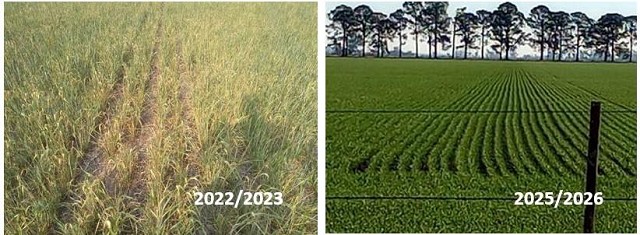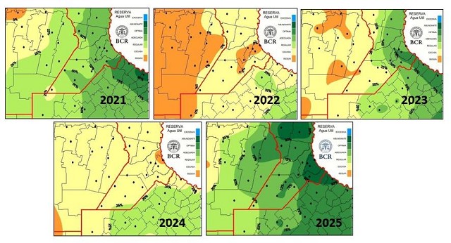 El seguimiento de las reservas de agua para la región son elocuentes. En los últimos 4 años la previa del maíz enfrentaba marcadas sequías y escasez de agua en el oeste de la región, y se veían algo mejor en el este. Solo finales de julio 2021 mostraba un escenario bueno. Pero claramente, ninguno es mejor que el que dejan estas lluvias inéditas en la región. Por el momento se espera un aumento en la siembra del maíz 2025/26 de un 17% respecto al ciclo pasado.