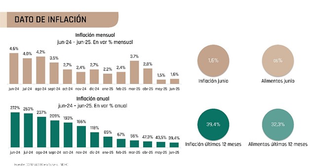 El Instituto Nacional de Estadística y Censos (INDEC) informó que la inflación de junio de 2025 fue del 1,6%, apenas por encima del 1,5% registrado en mayo, consolidando así un segundo mes consecutivo con niveles de inflación inferiores al 2%.