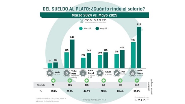 Respecto a la yerba mate, la mejora fue aún más significativa, con un 80% de aumento en el poder de compra. Esto equivale a 285 kilogramos adicionales, al pasar de 356 paquetes de medio kilo a 642 paquetes en el mismo período.