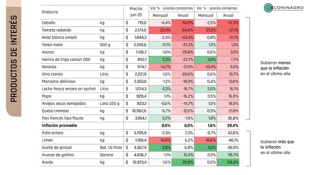 El impacto se observa con mayor intensidad en productos como la yerba mate, donde los costos han aumentado por encima de los precios, afectando la rentabilidad de los productores. Esta situación se replica en varias economías regionales que abastecen el mercado interno. Por poner algunos ejemplos: en el último año la cebolla y el tomate han perdido el 55% de su valor real, el arroz el 43,4%, y la yerba el 27,3%.