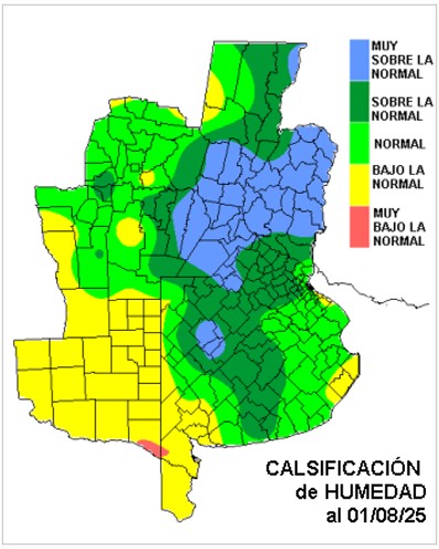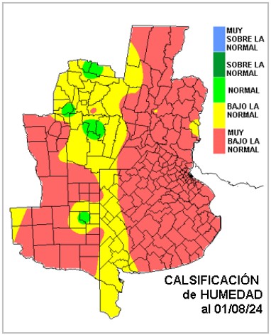 Si tomamos en cuenta las abundantes lluvias de julio en gran parte de la región pampeana y se analizan las condiciones de humedad actuales mediante la comparación con la estadística la serie de datos 1973-2024, se obtiene la clasificación de humedad en categorías, las cuales se expresan en forma cualitativa para hacer una comprensión primaria.