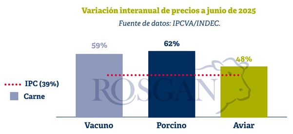 Todo ello con precios que, hasta la primera mitad del año, lejos de reflejar una presión bajista, terminaron registrando incrementos interanuales superiores a la inflación. En el caso de la carne vacuna, la suba fue del 59% en los últimos doce meses; del 62% para la carne porcina; y del 48% para la carne aviar, frente a una inflación minorista que finalmente logró mantenerse por debajo del 40% interanual.