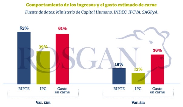 Del mismo modo, si tomamos solo este primer tramo del año —con datos del RIPTE a mayo— los ingresos mejoraron un 19%, frente a una inflación que marcó un 13% en ese período. Nuevamente, una inflación que, al ceder, descomprime el presupuesto del consumidor local, el cual preferentemente vuelve a optar por la carne vacuna, destinando un 36% más de su gasto en compras a este producto.