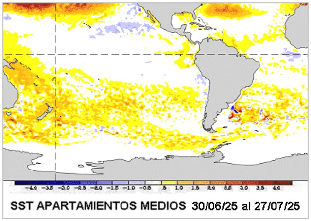 El análisis del principal forzante de escala planetaria queda altamente definido para el resto de la campaña. Puede haber momentos hacia el final de año, donde el agua fría se reorganice y en términos oceanográficos sea representativo e incluso vuelva a desplegarse el color azul típico del enfriamiento. La respuesta atmosférica es lenta. La persistencia del enfriamiento debe ser extendida y relativamente intensa. Desde nuestro punto de vista no es razonable establecer para esta campaña un escenario de riesgo basado en esta conjetura. Como venimos hablando en informes previos, seguimos claramente influenciados por la circulación de escala regional, la cual ha tenido suficiente eficiencia como para definir claras anomalías, tanto térmicas como pluviales.