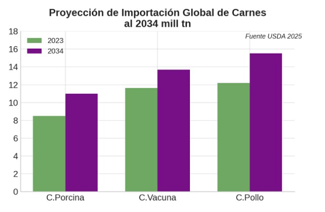 Como ejemplo de esta tendencia, basta con mirar las proyecciones del USDA sobre el comercio global de carnes hacia 2034.