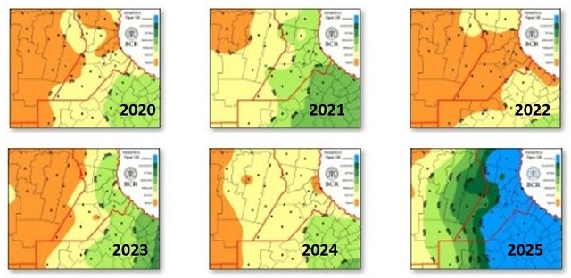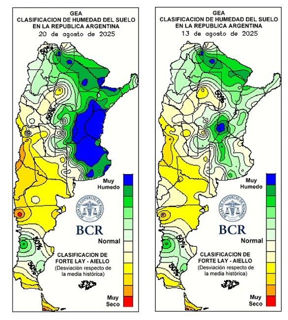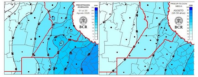 En julio ya se habían medido lluvias récord y agosto continuó con la misma tendencia, con registros muy notables para el invierno. Las 36 estaciones de la red GEA/BCR promedian 72 mm para agosto 2025 cuando la media mensual histórica señala 30 mm para la región. En localidades del noroeste de Buenos Aires se duplicaron e incluso quintuplicaron los valores normales del mes. Baradero acumuló 150 mm, mientras que Chacabuco llegó a 140 y Pergamino a 120. Rosario alcanzó los 100 milímetros. Al comparar con datos del 1 al 20 de agosto, en el 2015 los valores fueron de 177 mm para Chacabuco, 218 en Pergamino y 126 mm para Rosario, por lo que en los registros más importantes de los últimos 30 años, los valores del 2025 estan en 2do o 3er lugar, detras del 2025 pero no tan lejos.