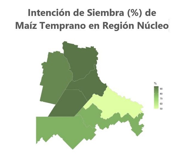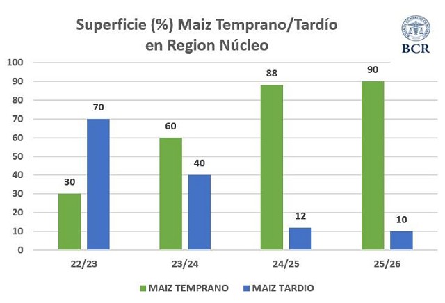 Antes del 2020 el maíz temprano solía ocupar el 92% del área total sembrada, pero luego, con repetidas primaveras frías y secas, el temprano cayó hasta el 30% en la campaña de la gran sequía, la 2022/23. Se recuperaron tras el temor q ue generó la Chicharrita (88%). Pero este año, no es el temor sino el entusiasmo lo que tracciona que la proporción del temprano que se espera sea del 90% sobre el total sembrado.